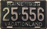 1939 | Embossed silver serial on dark green plate with border line; "MAINE 1939" centered at top | "VACATIONLAND" centered at bottom | 123-456 | 1 to approximately 160-000 | |||