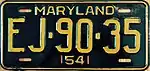 1941–44 | Embossed black serial on silver plate with border line; "MARYLAND" centered at top; "3-31" at top left and "1942" at top right | "DRIVE CAREFULLY" centered at bottom | 123-456 | 30-000 to approximately 654-000 | Revalidated through March 31, 1943 with yellow tabs, then through March 31, 1944 with black tabs, due to metal conservation for World War II. |