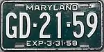 1957–58 | Embossed white serial on dark green plate with border line; "MARYLAND" and "EXP-3-31-58" centered at top and bottom respectively | none | AB-12-34 | Letter L added to two-letter series. | |