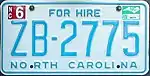 For Hire | 2006–present | Embossed blue on white with border line; "NORTH CAROLINA" at bottom; "FOR HIRE" at top | ZB-1234 | ZB-1001 to present | Issued annually through 2005.[9] Issuing ZM series as of September 27, 2020. |