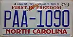 July 1, 2015 – present | Blue on reflective white with quill pen graphic | "First In Freedom" screened at top | ABC-1234 | PAA-1001 to RJP-7914 (as of October 27, 2023)[6] | Alternative issue. Includes dates of May 20, 1775 and April 12, 1776 commemorating the adoption of the Mecklenburg Declaration and Halifax Resolves, respectively.[7] Second letter in serials strictly A through M (so PMZ was followed by RAA, and RMZ will be followed by SAA). |