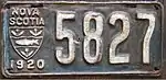 1920 | Embossed white serial on dark blue plate with border line; "NOVA SCOTIA", provincial shield and "1920" at left | 12345 | 1001 to approximately 12500 | First embossed plate. |
