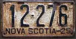 1925 | Embossed black serial on white plate with border line; "NOVA SCOTIA–25" at bottom | 12-345 | 1-001 to approximately 21-000 | |