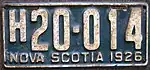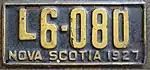1926 | Embossed white serial on dark green plate with border line; "NOVA SCOTIA 1926" at bottom | L12-345 | L1-001 to approximately L11-500 | 'L' prefix used for vehicles weighing 3,000 lb or less, and 'H' prefix for vehicles above 3,000 lb. This happened again in 1927.[3] |