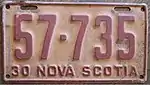 1930 | Embossed red serial on white plate with border line; "30 NOVA SCOTIA" at bottom | 12-345 | 40-001 to approximately 85-000 | |