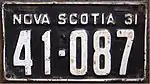 1931 | Embossed white serial on black plate with border line; "NOVA SCOTIA 31" at top | 12-345 | Coded by county group (1) | |