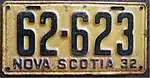 1932 | Embossed black serial on yellow plate; "NOVA SCOTIA 32" at bottom | 12-345 | Coded by county group (1) | |