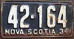 1934 | Embossed white serial on dark blue plate; "NOVA SCOTIA 34" at bottom | 12-345 | Coded by county group (1) | |