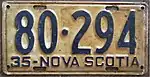 1935 | Embossed dark blue serial on white plate; "35-NOVA SCOTIA" at bottom | 12-345 | Coded by county group (1) | |