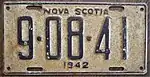 1942 | Embossed black serial on pale green plate with border line; "NOVA SCOTIA" and "1942" centred at top and bottom respectively | 1-23-45 | Coded by county group (1) | Produced in pairs but only single plates issued; the remaining plates were restamped and repainted for use in 1943 and 1944, due to metal conservation for World War II.[3] |
