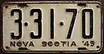 1943–44 | Embossed white serial on black plate with border line; "NOVA SCOTIA" and "1943" centred at top and bottom respectively | 1-23-45 | Coded by county group (1) | Restamped and repainted 1942 plates. Revalidated for 1944 with windshield stickers. |