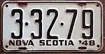 1948 | Embossed black serial on pale green plate with border line; "NOVA SCOTIA '48" at bottom | 1-23-45 | Coded by county group (1) | |