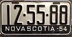 1953 | As above, but with "NOVA SCOTIA - 53" at bottom | 12-34-56 | 10-00-00 to 10-99-99 | Issued only to new registrants. Validated for 1954, 1955 and 1956 in the same manner as for 1952 plates. |