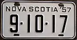 1957 | Embossed black serial on white plate with border line; "NOVA SCOTIA '57" at top | 1-23-45 12-34-56 |