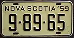 1959 | Embossed black serial on light yellow plate with border line; "NOVA SCOTIA '59" at top | 1-23-45 12-34-56 |