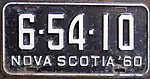 1960–61 | Embossed light yellow serial on black plate with border line; "NOVA SCOTIA '60" at bottom | none | 1-23-45 12-34-56 |