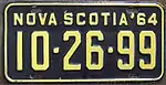 1964–65 | Embossed yellow serial on black plate with border line; "NOVA SCOTIA '64" at top | none | 1-23-45 12-34-56 |