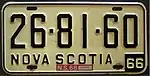1966–68 | Embossed black serial on yellow plate with border line; "NOVA SCOTIA" at bottom, offset to left; black box at bottom right containing debossed "66" | none | 1-23-45 12-34-56 |