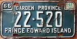 1966–68 | Embossed white serial on dark green plate; border lines around plate and around top corners; "PRINCE EDWARD ISLAND" at bottom; "66" at top left | "GARDEN PROVINCE" centred at top | 12-345 | 20-001 to approximately 61-000 | Revalidated for 1967 and 1968 with stickers. |