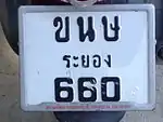 Some beginning with ฌ, ณ with green background and white text are used by service vehicles.