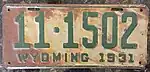 1931 | Embossed green serial on gray plate; green lines at top and bottom borders; "WYOMING 1931" at bottom | 1-1234 10-1234 |