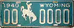 1940 | Embossed white serial and Bucking Horse and Rider on turquoise plate with border line; "1940 WYOMING" at top | 1-1234 10-1234 |