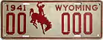 1941 | Embossed red serial and Bucking Horse and Rider on white plate with border line; "1941 WYOMING" at top | 1-1234 2-A123 10-1234 |