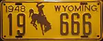 1948 | Embossed brown serial and Bucking Horse and Rider on golden yellow plate with border line; "1948 WYOMING" at top | 1-12345 10-1234 |