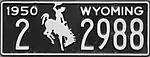 1950 | Embossed white serial and Bucking Horse and Rider on black plate with border line; "1950 WYOMING" at top | 1-12345 10-1234 |