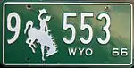 1966 | Embossed white serial and Bucking Horse and Rider on dark green plate with border line; "WYO 66" at bottom right | 1-1234 1-123A 1-A123 1/0-1234 1/0-123A |