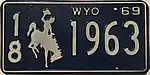 1969 | Embossed white serial and Bucking Horse and Rider on dark blue plate with border line; "WYO 69" at top right | 1-1234 1-123A 1-A123 1/0-1234 1/0-123A |