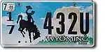 1975–77 | Embossed light blue serial and screened light blue Bucking Horse and Rider on white plate with light blue border line; red band screened at bottom containing "19 WYOMING 75" in white | "THE SPIRIT OF '76 — In the American West!" screened in red Wild West-style font centered at top | 1-1234 1-123A 1-A123 1-A/B123 1/0-1234 1/0-123A |