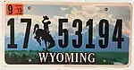 January 2016 – present | Screened black serial and Bucking Horse and Rider on graphic plate featuring the Green River Lakes and Squaretop Mountain against a cloudy blue sky; golden yellow rope border around plate; "WYOMING" screened in yellow centered at top | none | 1-12345 2-1234A 1/0-12345 |