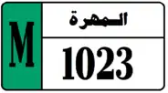 Al Mahrah Governorate License Plates consist of black text and black boundary on white background. Hadramaout Governorate plates consist of the governorate name in Arabic (المهرة) and a 4 digit number. Al-Mahrah Governorate plates also have a strip on the left hand side with the letter M in black on a background whose color depends on the classification of the vehicle. Similar to Hadramout, The license plates for Al-Mahra use a unique serif font.[5]
