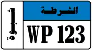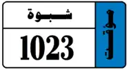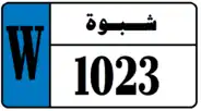 Starting from February 2020, Shabwah Governorate joined Hadhramaut Governorate in issuing license plates in this new format and appearance. Similar to Hadhramaut, Shabwah License Plates consist of black text and black boundary on white background. Shabwah Governorate plates consist of the governorate name in Arabic (شبوة) and a 4 digit number. Shabwah Governorate plates also have a strip on the left hand side with the letter W in black on a background whose color depends on the classification of the vehicle. Temporary plates have a strip on the right hand side that says "مؤقت", meaning temporary, on a blue background. The license plates for Shabwah use a unique serif font.[7]