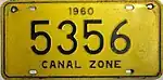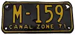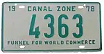 The former U.S. territory of the Canal Zone first issued license plates in 1910, and this continued until the Canal Zone was returned to Panama in 1979.[1] A single plate was issued for all years. The country of Panama also issued Canal Zone license plates for United States citizens that lived in Panama but worked in the Canal Zone, but these plates have the country name "Panama" clearly showing on them.[2] Since reciprocity for license plates between the Canal Zone and Panama did not exist until 1950, old photos often show local vehicles with two different license plates mounted on the vehicle.[3]
