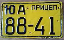 The new format was once again based on the old "reduced" format, only changing the color of the background to orange and the color of letters and numbers to black. Diplomatic plates used a different "Д-NN" format for frontal plates, with the Д on the top row and the digits on the bottom row for rear plates. There were also formats for trailers, which formerly bore the same number as the truck attached to it. The format for trailers was the same as the rear version of civil plates, only with the inscription "прицеп" (pritsep, "trailer") next to the regional code.