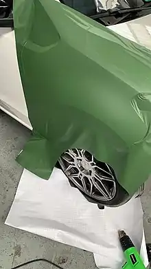 A vehicle vinyl wrap[1] describes the automotive aftermarket practice of completely or partially covering a vehicle's original paint with a vinyl wrap. Generally this vinyl wrap will be a different color or finish like a gloss, matte or clear protective layer. Other terms used to refer to vehicle vinyl wrap are car wrap, paint wrap, color change wrap, vehicle graphics, and paint protection film.