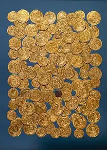 The Vejby Treasure (Danish: Vejbyskatten), also known as the Vekby Beach Treasure (Danish: Vejby Strand Skatten), is a treasure trove discovered in 1976 on shallow water off the north coast of Zealand at Vejby Beach, Gribskov Municipality, some 60 km north of Copenhagen, Denmark. It consists of 110 gold coins and a single copper coin. 109 of the gold coins are English nobles and one is a Lübeck guilder. It comes from a cog which wrecked at the site some time between 1377 and 1380 on its way to the Baltic Sea or the Skåne Markets for trade. It is now on display in the National Museum of Denmark.