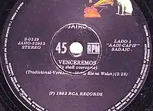 "Venceremos" is a Chilean song written by Claudio Iturra (an alternative version of text was written by Víctor Jara) and composed by Sergio Ortega for the 1970 election campaign of Salvador Allende. The title (pronounced [ben.seɾˈe.mos]) translates to "We shall prevail".