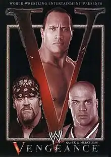 The main feud from SmackDown! heading into Vengeance was between The Rock, Kurt Angle and The Undertaker fighting for the WWE Undisputed Championship. At King of the Ring, The Undertaker defeated Triple H to retain the title.[9] During the match, The Rock interfered hitting The Undertaker with a Rock Bottom. The Undertaker, angry because of The Rock's interference, asked Mr. McMahon for a match with The Rock. McMahon booked the match for Vengeance and told The Undertaker that it was for the championship. On the July 4 episode of SmackDown!, however, The Undertaker wrestled Angle to a draw in a WWE Undisputed Championship match, when The Undertaker pinned Angle and tapped out to Angle's submission hold at the same time.[10] On the July 8 episode of Raw, McMahon announced that Angle would be added to the match, making it a triple threat match.[11] On the July 11 episode of SmackDown!, The Rock made his return to confront Angle, who challenged him to a match the next week, only for The Undertaker to attack both The Rock and Angle. Later that night, as Angle teamed up with Chris Jericho against John Cena and The Undertaker, The Rock hit the Rock Bottom on both Angle and The Undertaker. On the July 18 episode of SmackDown!, The Rock defeated Angle by disqualification due to interference from The Undertaker. Angle then nailed The Undertaker with a chair.
