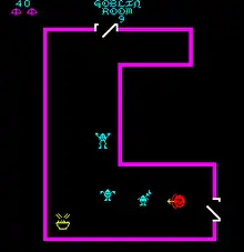 Winky is equipped with a bow and arrow and explores a dungeon with rooms and hallways. The hallways are patrolled by large, tentacled monsters named Hallmonsters, which cannot be killed, injured, or stopped in any way. Once in a room, Winky may kill monsters, avoid traps and gather treasures. If he stays in any room too long, a Hallmonster will enter the room, chase and kill him. In this way, the Hallmonsters serve the same role as "Evil Otto" in the arcade game Berzerk. The more quickly the player finishes each level, the higher their score.