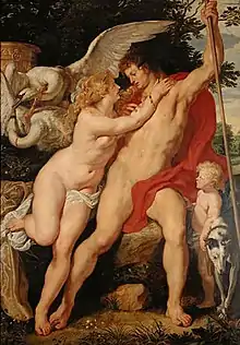 Venus and Adonis is an oil on canvas painting by Peter Paul Rubens and his studio, executed c. 1614, now in the Hermitage Museum, in Saint Petersburg.[1] It is a version of an autograph work from 1609 now in the Museum Kunstpalast in Düsseldorf, replacing its rocky background with Venus's attribute of a golden chariot. A third version was in the Kaiser-Friedrich-Museum in Berlin until being destroyed during World War Two.