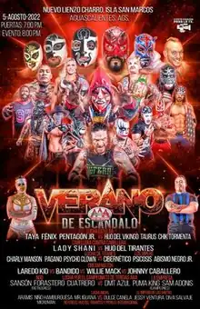In September 1997 Mexican professional wrestling, company Asistencia Asesoría y Administración, later known as simply AAA and then Lucha Libre AAA Worldwide, added a new major event to their schedule as they held the first ever Verano de Escándalo ("Summer of Scandal") show on September 14, 1997.[1] The Verano de Escándalo show became an annual event from 1997 until 2011, usually held in September, with few exceptions. In 2012 AAA changed their major event schedule as they pushed Triplemanía XX to August instead of holding the show in June or July as had been the case up until 2012.[2] With the change to the schedule AAA did not hold a Verano de Escándalo show in 2012 and 2013. In 2014 the show was put back on the schedule, but held in June instead, filling the void left when Triplemanía was moved.[3] AAA did not hold a Verano de Escándalo in 2016, instead holding the Lucha Libre World Cup in June.[4] A Verano de Escándalo show was not held in 2020 due to the COVID-19 pandemic. The 2022 Verano de Escándalo show was the 22nd show in the series.