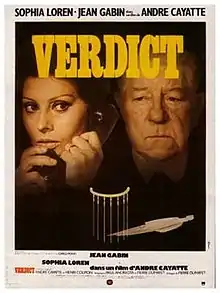 Verdict is a 1974 French-Italian drama film, directed by André Cayatte, starring Sophia Loren, Jean Gabin and Julien Bertheau.[1] A French judge comes under intense personal pressure to acquit a man who is accused of murdering his lover.[2] It was also released under the title Jury of One.