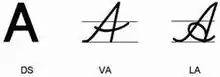 The Vereinfachte Ausgangsschrift (VA, meaning "simplified written script") is a simplified form of handwriting primarily based on the Lateinische Ausgangsschrift. It was developed in 1969 and tested since 1972. The letters have been simplified and the shapes approximated the block letters. In 10 of the 16 German federal states, it is available for schools to choose from, among other cursives.