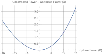 The following plots show the difference in spherical power at a 0 mm vertex distance (at the eye) and a 12 mm vertex distance (standard eyeglasses distance). 0 mm is used as the reference starting power and is one-to-one. The second plot shows the difference between the 0 mm and 12 mm vertex distance powers. Above around 4D of spherical power, the difference versus the corrected power becomes more than 0.25 D and is clinically significant.