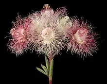 The flowers are unscented and arranged in rounded groups near the ends of the branches, each flower on a stalk 4–11 mm (0.2–0.4 in) long. The floral cup is top-shaped, 2–3 mm (0.08–0.1 in) long, smooth and partly hairy. The sepals are creamy-white, ageing to pink or reddish, 5–6 mm (0.20–0.24 in) long and lack lobes but are deeply divided with spreading hairs, some of which are longer and more prominent than others. The petals are a similar colour to the sepals, more or less round and spreading, with a fringe of hairs around their edge and 2–4 mm (0.08–0.2 in) long. The staminodes are lance-shaped to egg-shaped, tapering towards the tip which is fringed with a few hairs. The style is straight, 5–5.5 mm (0.20–0.22 in) long, hairy around its upper part and has a cap-like stigma. Flowering time is mostly from September to November.[2]