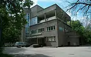 The Vesnins continued competing for contracts in Ukraine, specifically Kharkiv. In 1930 they made a bid for the Cooperation Building and Government Building on Dzerzhinsky Square (opposite the Gosprom Building).[74] Their draft was deemed the best aesthetically, but was not executed due to high estimated costs.[75] Also in 1930, they won an international contest for the 6,000-seat Kharkiv Theatre.[76][77] Although the Vesnin brothers won the contract to produce working drawings, they were forced to share control with Arkady Mordvinov and his VOPRA associates, harsh critics of the OSA Group and other established architects. Friction among the "team" delayed construction for years;[78] the project was abandoned when the capital of Ukraine relocated from Kharkiv to Kiev.[78][79]