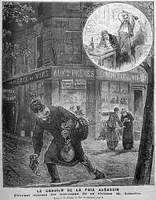 On September 10, 1879, at about 8 o'clock in the evening, Madame Thiéry, a resident of the district which was deserted at this hour, saw at the corner of the Rue de La Chapelle and Rue du Pré maudit the tall figure of a man, dressed in a cattle driver's gown and a silk cap, leaning over the stream that passed there.[13] Intrigued, she watched him from a distance and ended up seeing him walk away towards Ney Boulevard. Madame Thiéry cautiously approached the place he abandoned and discovered, half stuck in a manhole, a packet containing freshly cut meat. At that moment, a peacekeeper named Hardy came by and she asked him for help. They immediately decided to take the package to the police station, but took the advice of a butcher and a pharmacist, who recognized fragments from a skinned human arm. Research was immediately undertaken and 77 additional pieces were discovered, three of which were recovered from a rag-picker who was about to sell them for consumption. Other parts, including a hand and "the parts of a person who belongs to the male sex"[14] were found in a ditch near the fortifications near the Poterne des Poisonniers. At the Paris morgue, where the pieces were transferred, efforts were made to reconstitute the body of the victim by reassembly, as to when they were discovered, that still remained a secret. In the end, only the head was missing, as well as a piece that could never be found because a poor man had probably "picked up it carefully, packaged it, like a piece of veal falling from the net of a housewife, cooked it in his hut and enjoyed it with the family."[4]